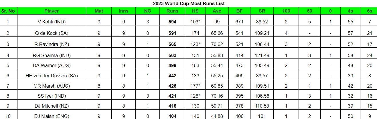 Rassie van der Dussen (442), Mitchell Marsh (426), Shreyas Iyer (421), Daryl Mitchell (418), and Dawid Malan (404) are ranked between sixth to 10th in the most runs list.