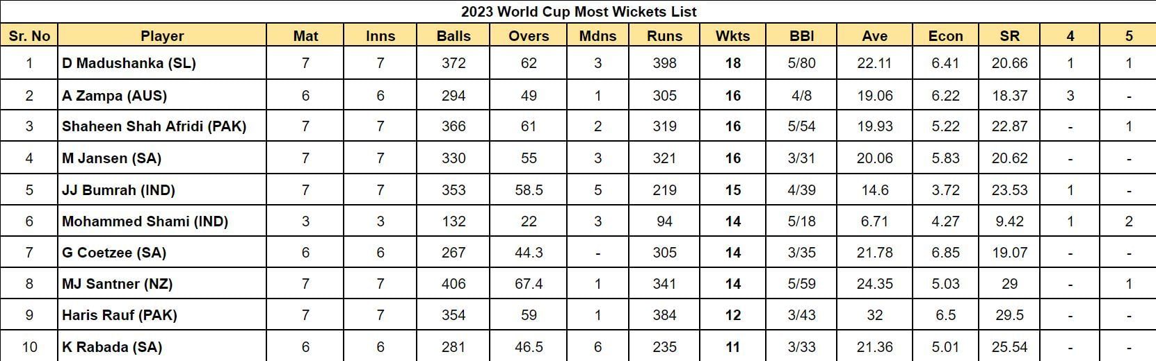 Sri Lankan pace sensation Dilshan Madushanka is leading the bowling standings with 18 wickets from seven innings. Australian leg-spinner Adam Zampa has bagged 16 wickets from six innings to secure the second spot. Pakistan pacer Shaheen Afridi is ranked third with 16 scalps.