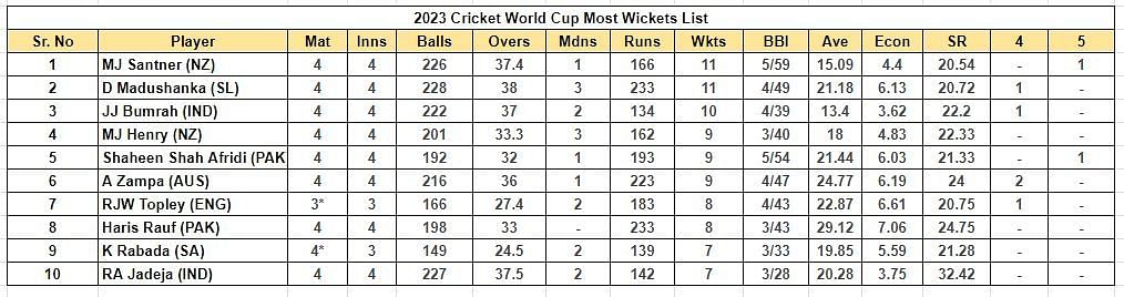 2023 World Cup Most Wickets List