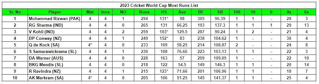 Mohammad Rizwan is the leading run-scorer in the tournament. He has amassed 294 runs in four innings at an average of 98 and a strike rate of 96.39.