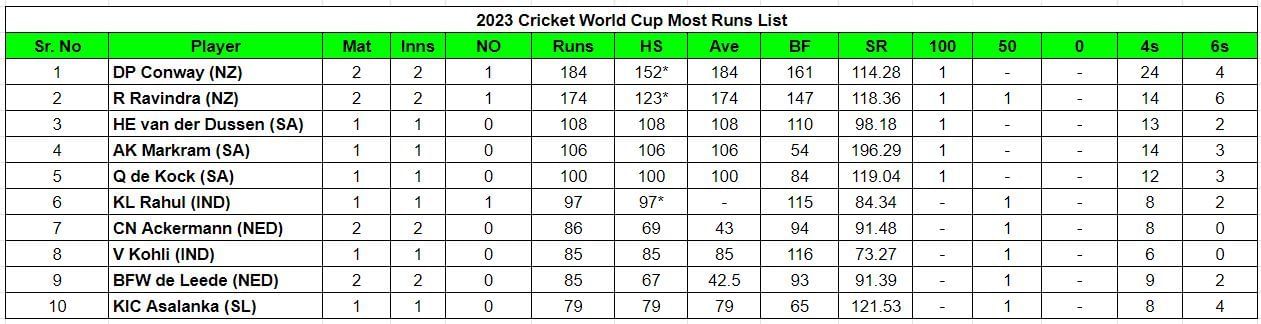 Kiwi opener Devon Conway continued to stay on top with 184 runs from two innings. No.3 batter Rachin Ravindra maintained his second rank, scoring 174 runs. South African star batter Rassie van der Dussen has accumulated 108 runs to bag the third spot.