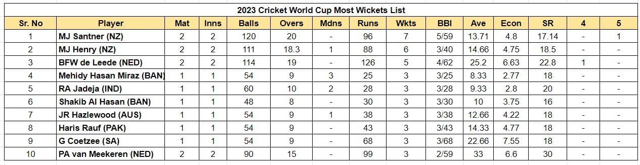 The New Zealand spinner picked his ODI career’s second five-wicket haul to bag seven scalps overall in the campaign. Matt Henry, the Kiwi pacer, secured the second spot, scalping six wickets.