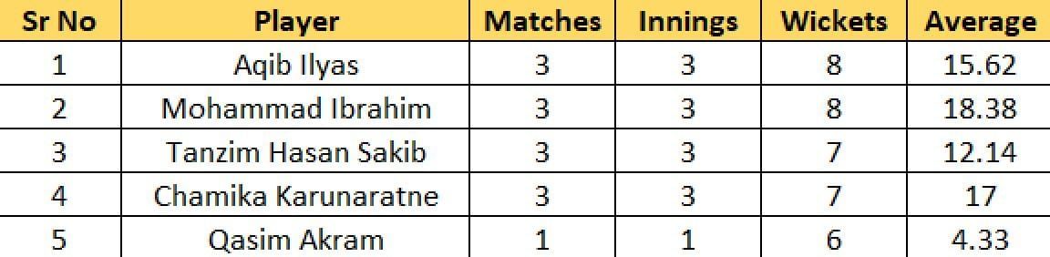 Mohammad Ibrahim has also picked up eight wickets in the competition and sits below Ilyas, as he has an average of 18.38. Ibrahim was a touch expensive against Bangladesh as he registered figures of 1/73 in his 10 overs. He is, still, Afghanistan A’s leading wicket-taker in the tournament.