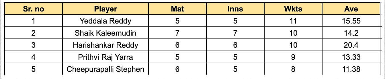 Kings' bowlers Shaik Kaleemudin and Harishankar Reddy bagged the second and third positions notching up 10 wickets each. Prithvi Raj Yarra, the Uttarandhra Lions left-arm pacer, settled with the fourth spot and Coastal Riders key bowler C Stephen is at the fifth slot with eight scalps to his name.