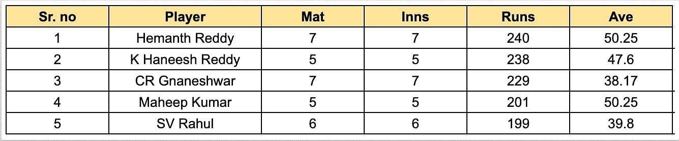 Kings opener Kogatam Haneesh Reddy's 92-run knock propelled him to the second position accumulating a total of 238 runs at an average of 47.6. Titans skipper cum opener Chengalpet Rajan Gnaneshwar settled with the third position amassing 229 runs.
