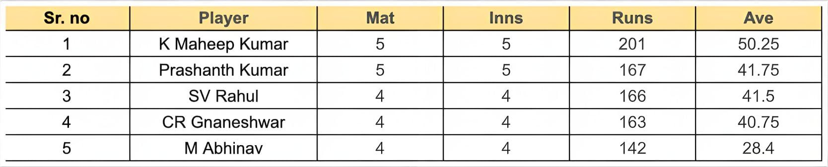Uttarandhra Lions batter Sreeram Venkata Rahul has slipped down to the third position. Godavari Titans batter C Gnaneshwar is in the fourth slot with 163 runs and Bezawada Tigers' Munnangi Abhinav is in the fifth position with 142 runs.