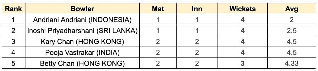 A total of four bowlers have scalped four wickets on the wickets column list. Andriani Andriani, the Indonesian medium pacer, is leading the chart with a better bowling average.