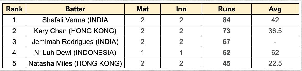 Indonesian batter Ni Luh Dewi is currently occupying the fourth position, accumulating 62 runs in just one inning. Hong Kong's Natasha Miles settled with the fifth rank, mustering 45 runs from two matches.