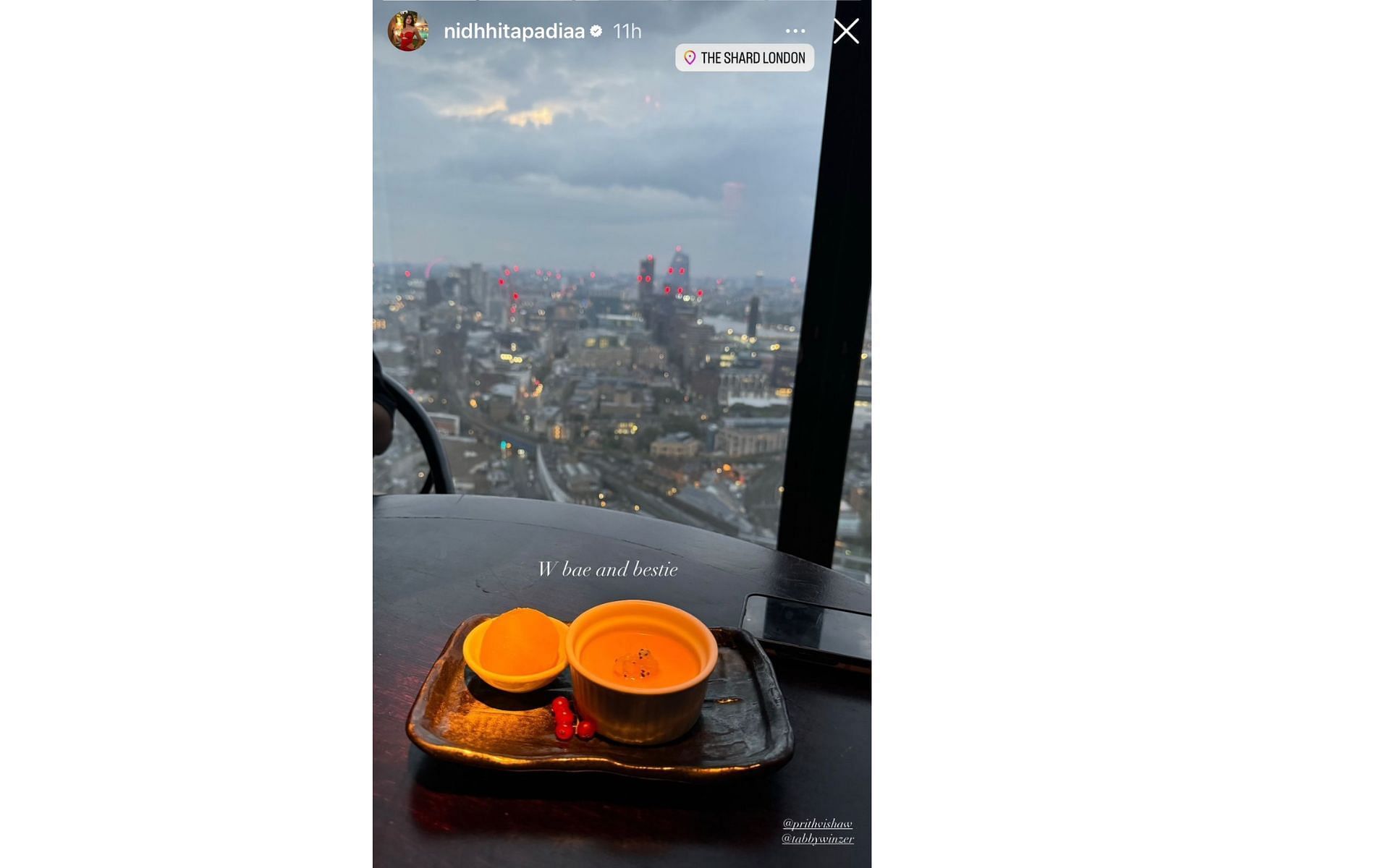 Taking to her official Instagram handle on Monday, September 23, Nidhi shared a story from The Shard, London. The actress was in the company of Shaw and one of her close friends.