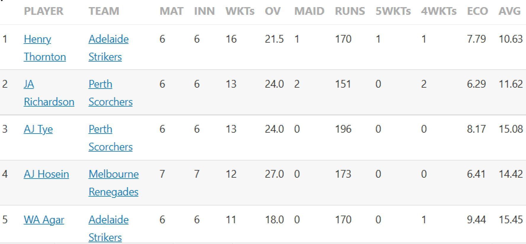 Henry Thornton of the Adelaide Strikers remains the top wicket-taker of the tournament. The fast bowler has picked up 16 wickets from six matches with one four-wicket and one five-wicket haul to his name.