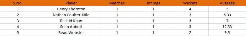 Nathan Counter-Nile, Rashid Khan, and Sean Abbott follow him on the list as all of them have picked up three wickets apiece.