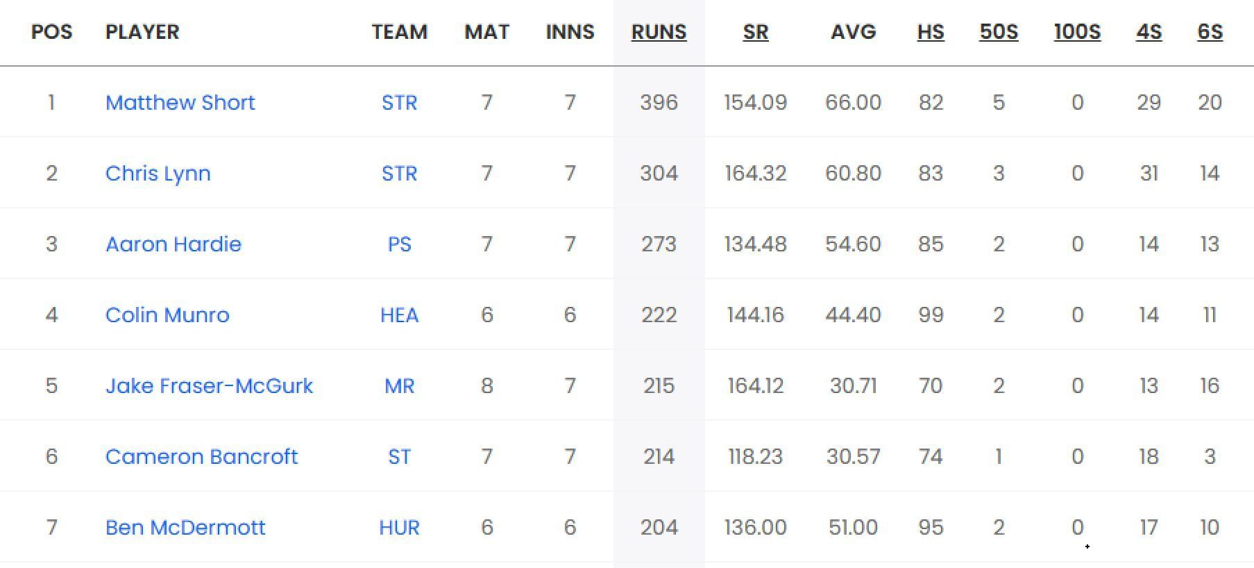 Matthew Short is the leading run-scorer of BBL 2023. The right-handed batter has scored 396 runs from seven matches at an average of 66 and a strike rate of 154.09 with five half-centuries and a top score of 82 to his name. His teammate, Chris Lynn is second in the list, having scored 304 runs from seven games at an average of 60.80 and a strike rate of 164.32 with three fifties to his name.