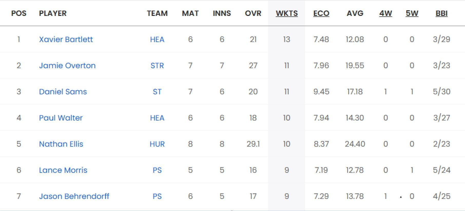 Xavier Bartlett of the Brisbane Heat is the leading wicket-taker of the ongoing BBL. The fast bowler has taken 13 wickets in six matches at an economy rate of 7.48. Jamie Overton of the Strikers has also been decent, having picked up 11 wickets from seven games at an economy rate of 7.96.
