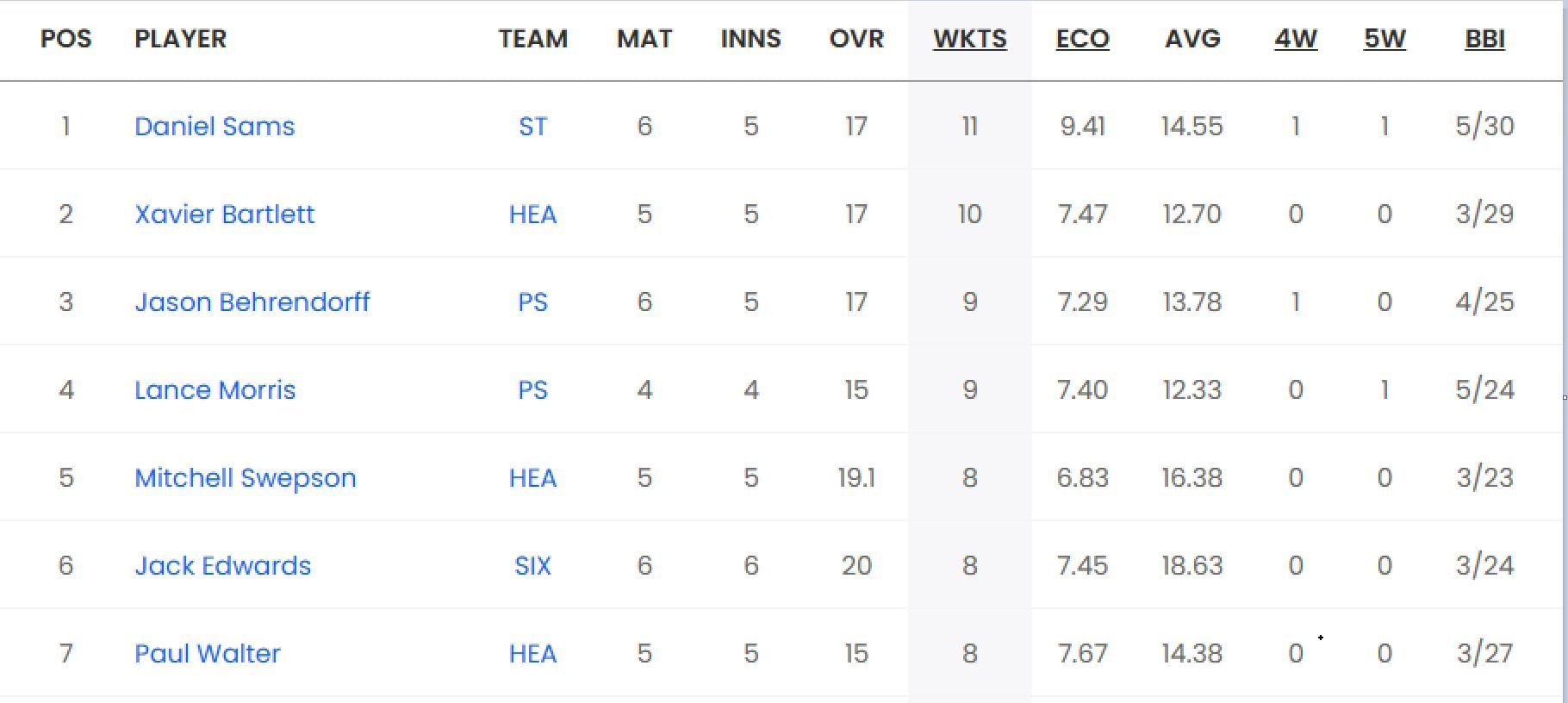 Xavier Bartlett of the Heat has also been exceptional, having taken 10 wickets from five matches at an economy rate of 7.47. Lamce Morris and Jason Behrendorff have nine scalps to their names.