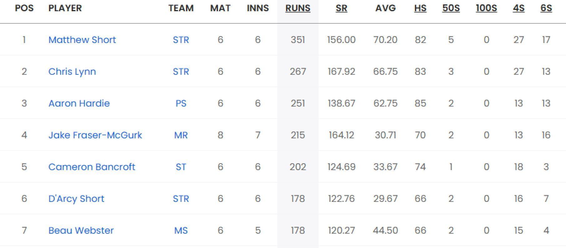 Short’s teammate Chris Lynn has racked up 267 runs from six games at an average of 66.75 and a strike-rate of 167.92 with three half-centuries to his name. Aaron Hardie of the Perth Scorchers is third in the list, having scored 251 runs from six matches at an average of 62.75 with a top score of 85.
