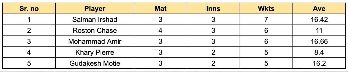 Salman Irshad, the Jamaica Tallawahs fast bowler, bagged a wicket against the Warriors, to claim the pole position with seven scalps. Spinner Roston Chase and pacer Mohammad Amir are at the second and third spots, respectively, with six wickets each.