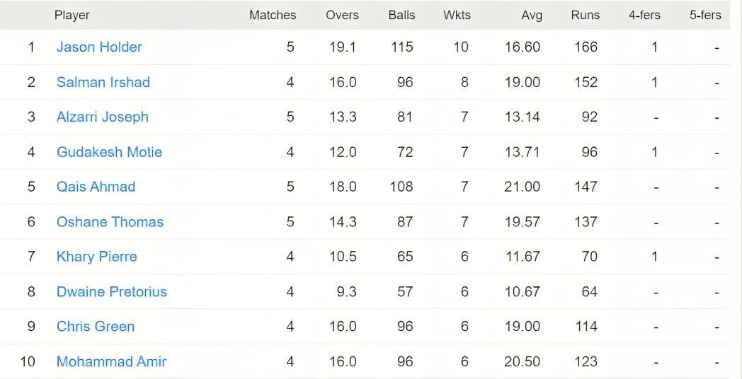 Alzzari Joseph moves to the third position in the wickets column after delivering a superb spell of 3/7 in his three overs. He now averages 13.14 with the ball and has claimed seven wickets so far in the tournament at a jaw-dropping economy of just 6.81 RPO.