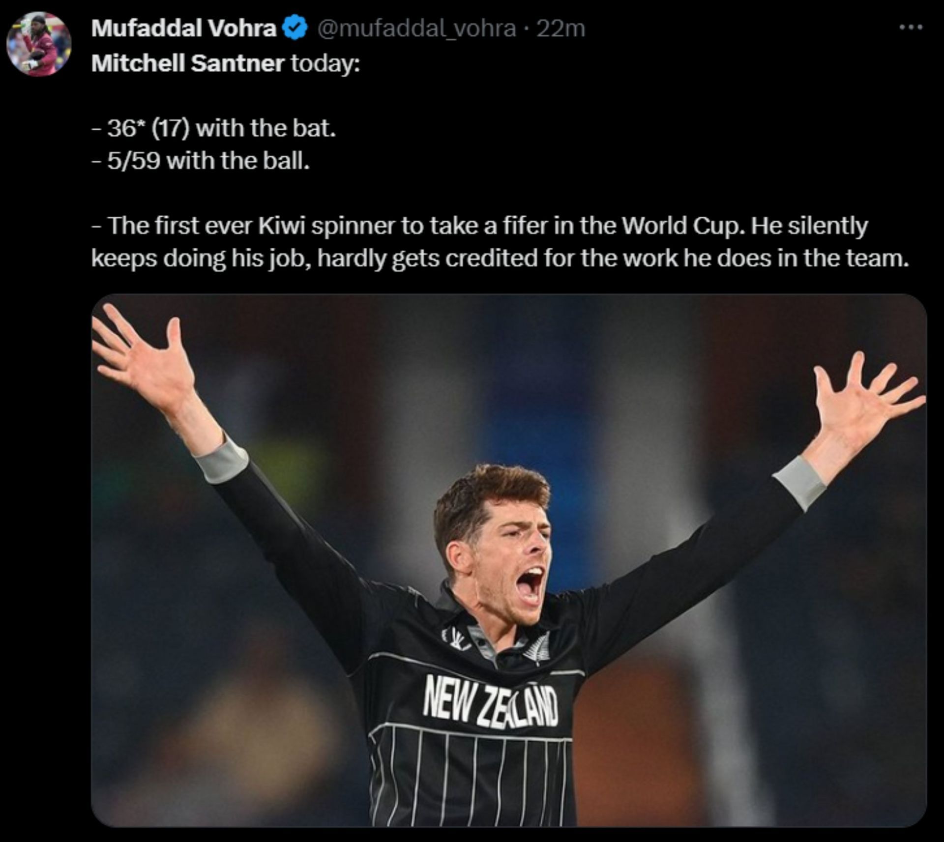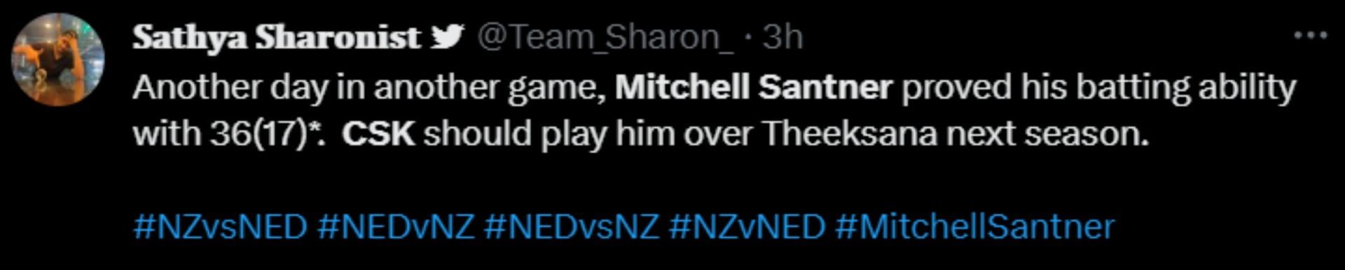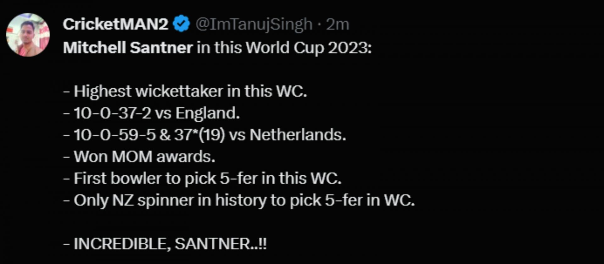 Fans took notice of Santner's all-round brilliance in the match against the Netherlands on Monday. Here are some of the top reactions: