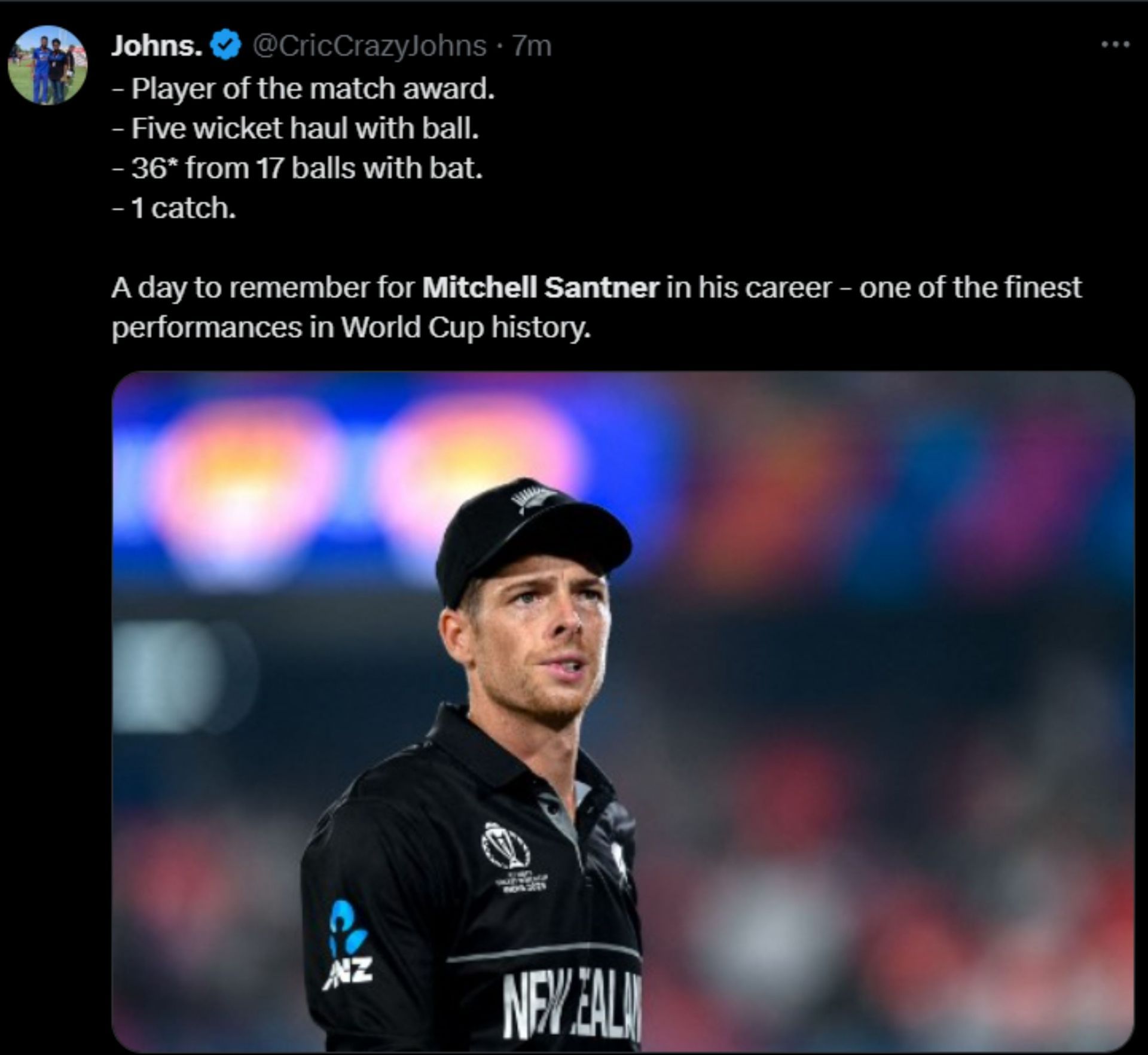 New Zealand spinner Mitchell Santner put on a brilliant all-round performance against the Netherlands team in the sixth match of the 2023 World Cup at the Rajiv Gandhi International Stadium in Hyderabad on Monday (October 9). New Zealand registered a comfortable 99-run win on the back of his performance.