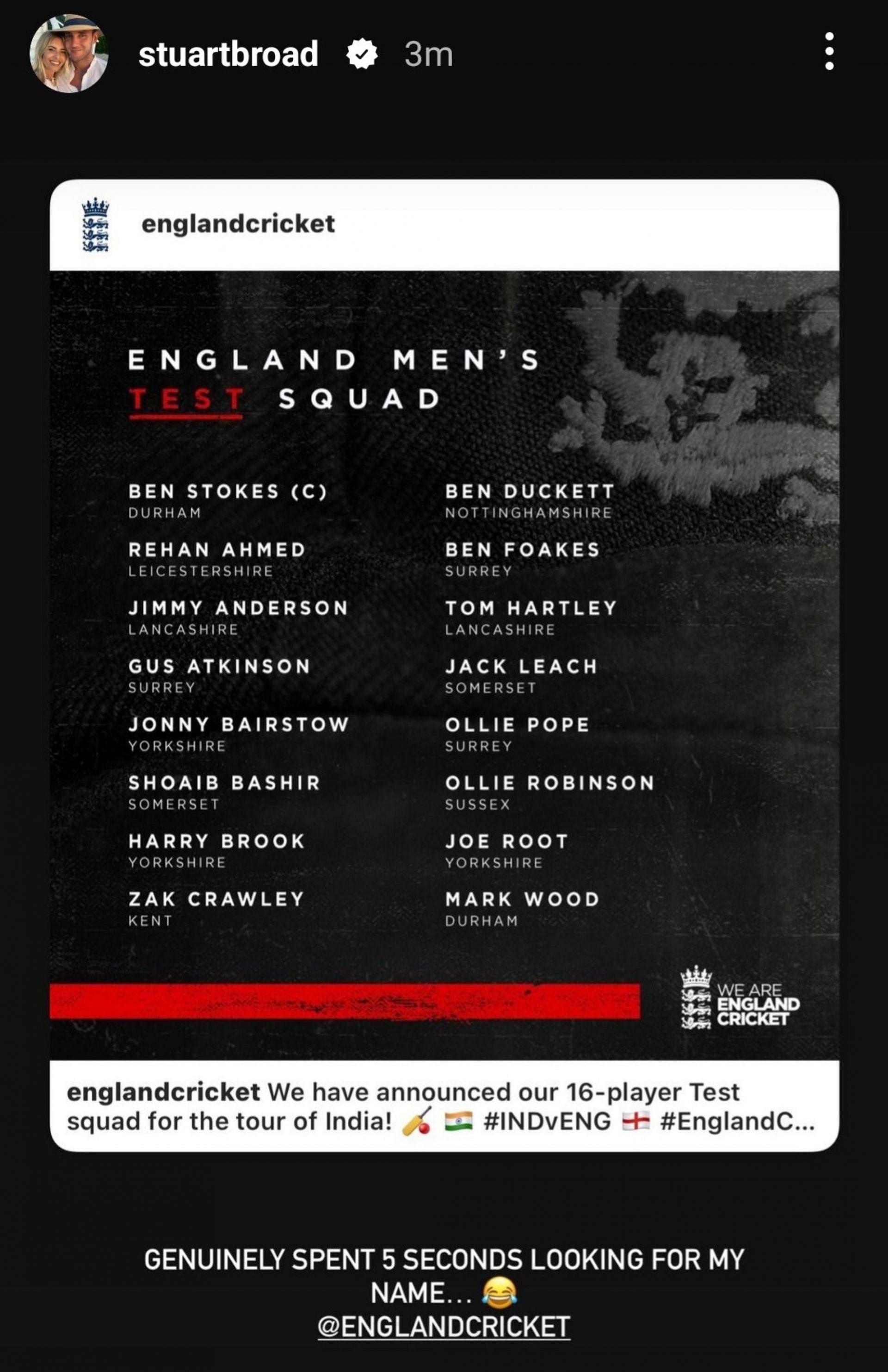 Sharing the picture of the squad on his Instagram story, Stuart Broad wrote: