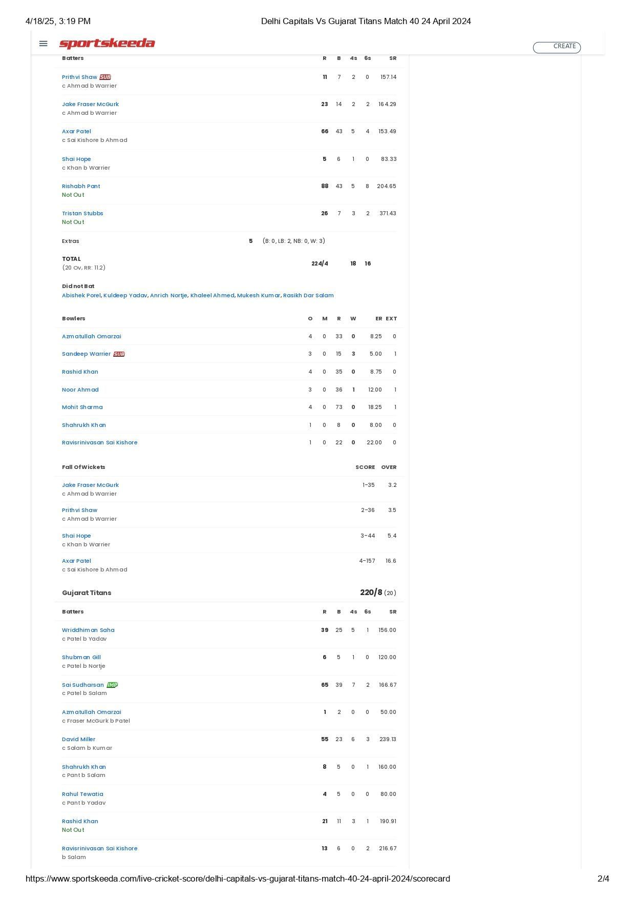 Asked to bat first, DC put up 224/4 in 20 overs. Delhi lost three wickets early before Axar Patel scored 66 off 43 balls, comprising four sixes and five boundaries. Rishabh Pant scored an unbeaten 88 off 43 deliveries with the help of eight maximums and five boundaries. Tristan Stubbs played a cameo, scoring 26 runs off seven deliveries.