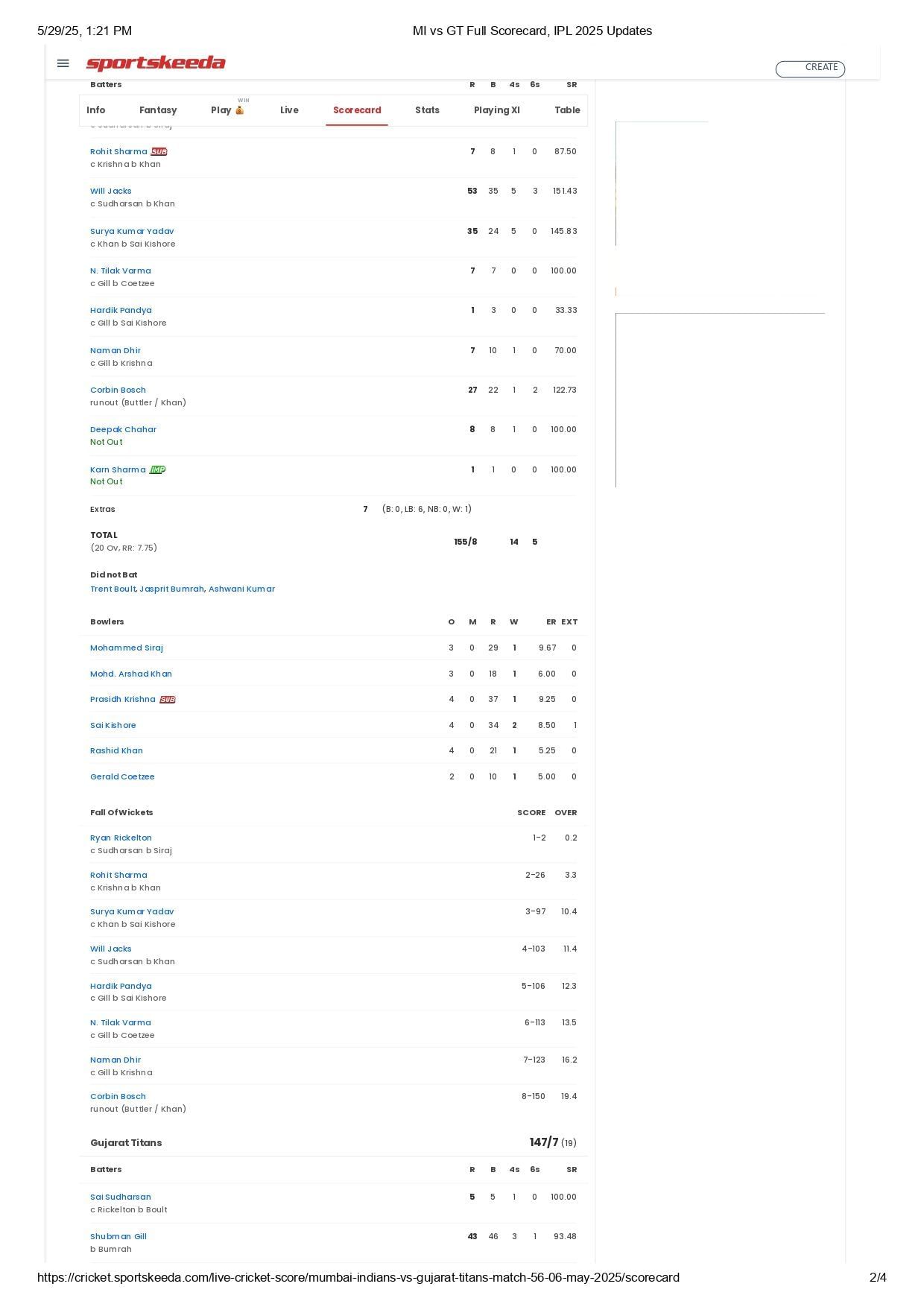 In response, GT achieved the revised target of 147 in 19 overs. Sai Sudharsan fell early but skipper Shubman Gill top-scored with 43 off 46, comprising one maximum and three boundaries. Jos Buttler and Sherfane Rutherford also chipped in with 30 (27) and 28 (15), respectively. Trent Boult, Jasprit Bumrah, and Will Jacks scalped two wickets apiece for Mumbai, while Deepak Chahar bagged one wicket.
