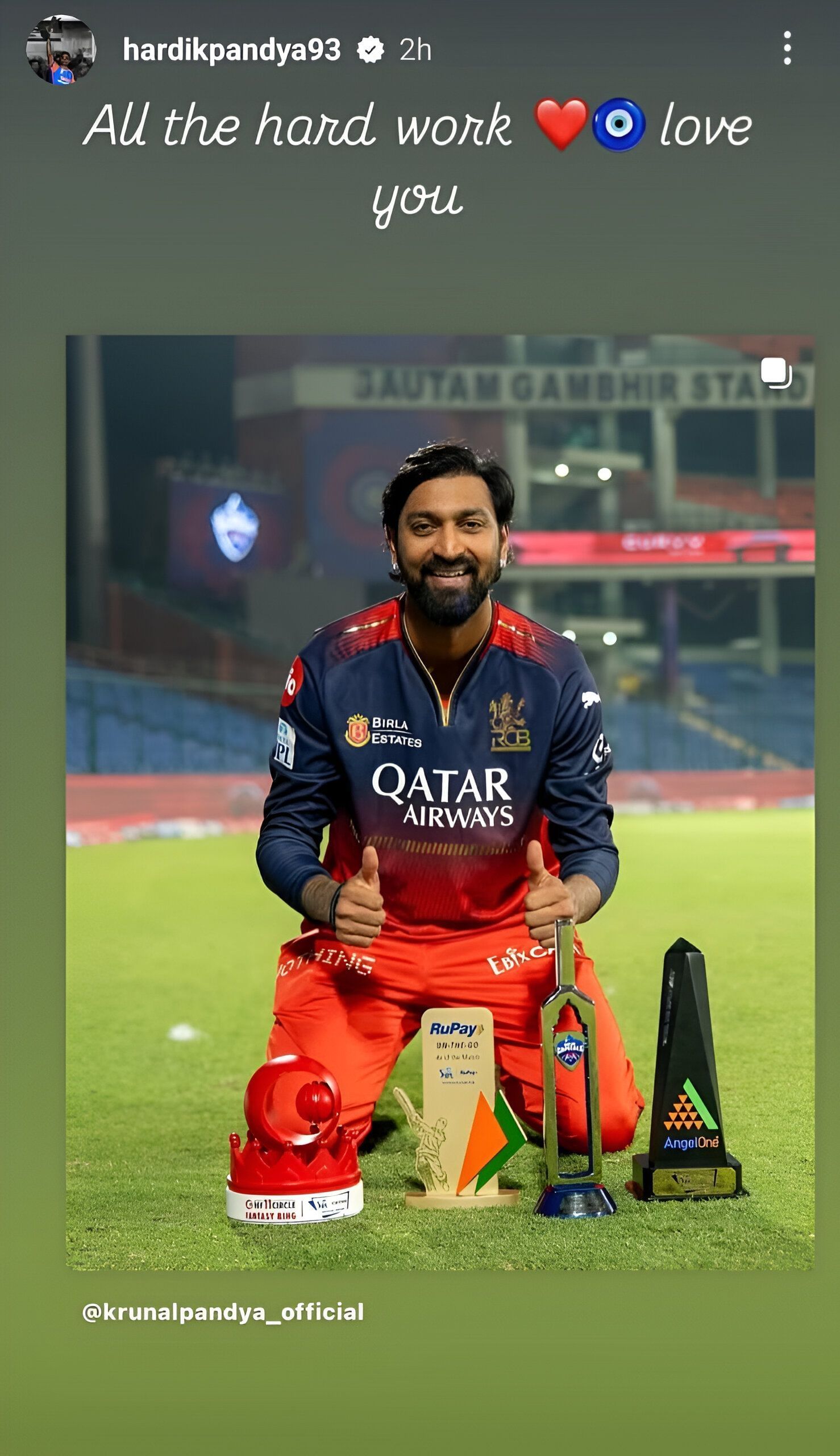 "All the hard work. Love you," he wrote on his story with a picture of Krunal in RCB colors after the game.