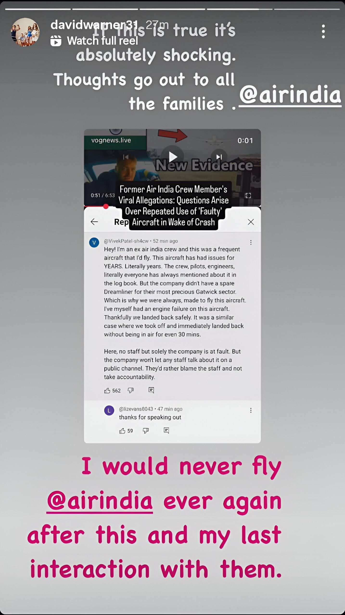 Following the accident that led to over 200 deaths, David Warner called the airline out via an Instagram story. Warner posted a screenshot of a comment by a former Air India crew member, who accused the airline of using a faulty aircraft. Tagging the airline, Warner wrote that it is 'absolutely shocking' if true. He added that he would never fly with Air India again.
