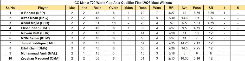 ICC Men's T20 World Cup Asia Qualifier Final 2023 Most Wickets