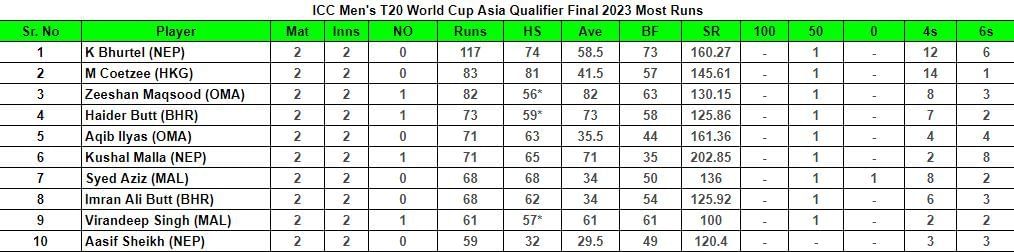 Bahrain middle-order batter Haider Ali Butt has accumulated 73 runs from two innings and occupies the fourth position with Oman's Aqib Ilyas settling with the fifth rank, having scored 71 runs.