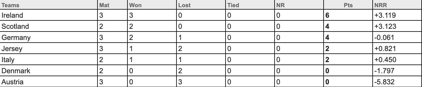 After the end of the day, Ireland leads the points table with three wins in three games, being the only team to reach six points so far. Scotland and Germany follow them at number 2 and 3 respectively with four points each and the NRR being the only difference separating the two sides.