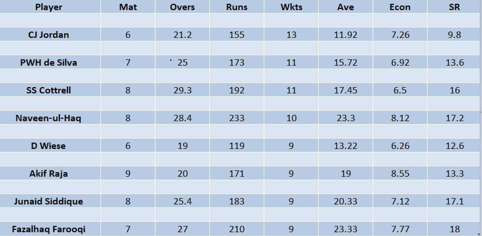 Naveen-ul-Haq of Sharjah Warriors, David Wiese of the Gulf Giants and Akif Raja of the Dubai Capitals have 10, nine, and nine wickets, respectively.