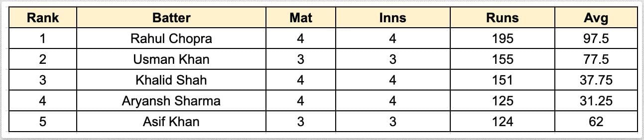 Marvels batter Rahul Chopra is the new leading run-scorer, amassing 195 runs in four innings. Usman Khan, Blitzer's star player, secured the second rank, accumulating 155 runs from three innings.