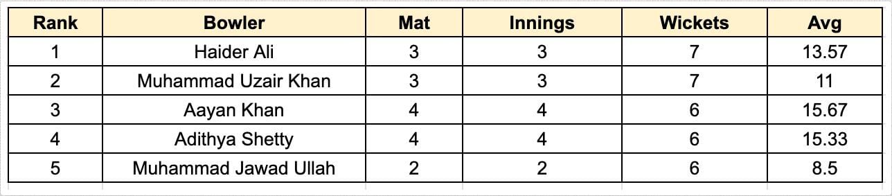 Marvel left-arm spinner Aayan Khan is in third, bagging six wickets, with leg-spinner Adithya Shetty and left-arm pacer Muhammad Jawad Ullah securing fourth and fifth slots respectively with the same number of wickets.