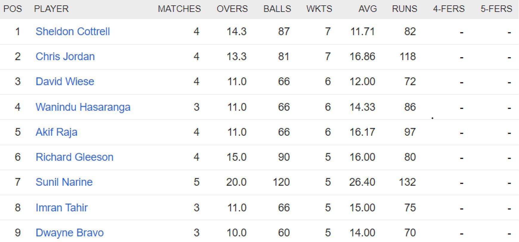 Chris Jordan of the Gulf Giants also has seven wickets, but Cottrell has a better bowling average of 11.17 compared to Jordan. David Wiese, Wanindu Hasaranga and Akif Raja have six wickets apiece in the championship.