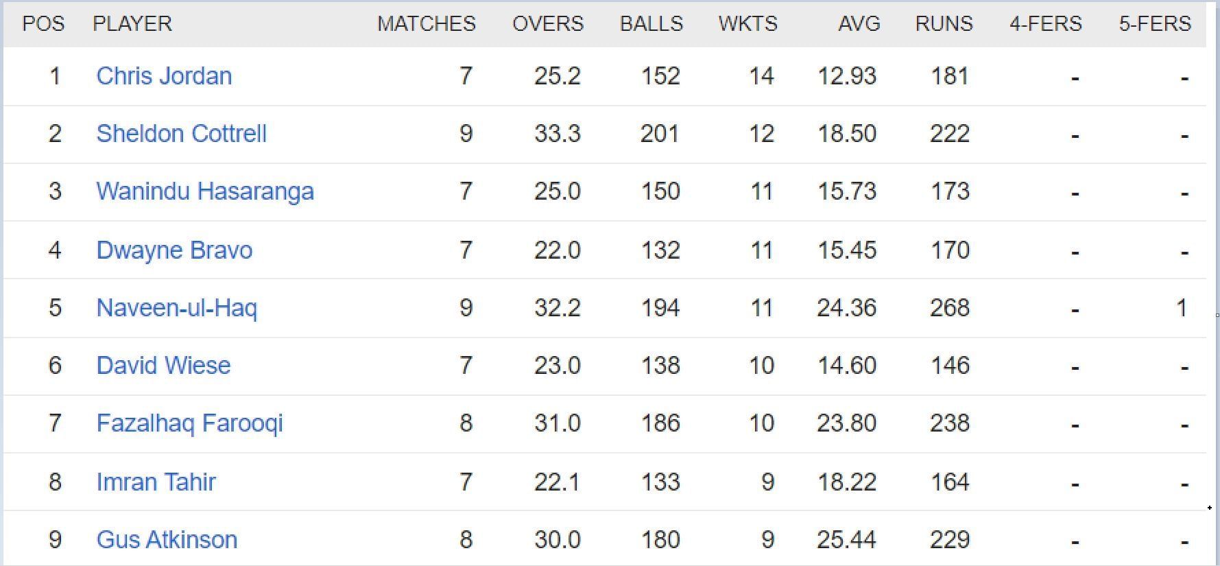 Dwayne Bravo, Wanindu Hasaranga and Naveen-ul-Haq have 11 wickets apiece to their names.