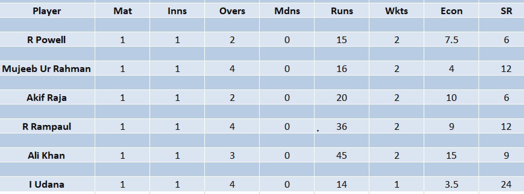 Rovman Powell is currently at the top of the wicket-taker’s list in the tournament. The pacer picked up two wickets. Mujeeb Ur Rahman, Akif Raja, Rampaul and Ali Khan also picked up two wickets each. However, Powell is on the top as he took the wickets in only two overs with an average of only 7.5.
