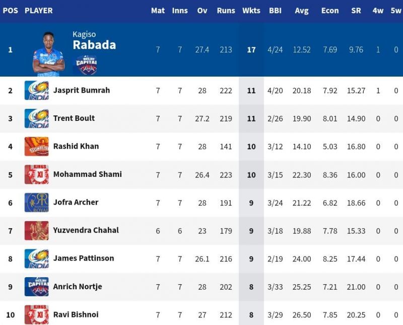 Trent Boult dismissed DC opener Prithvi Shaw to draw level with Bumrah’s tally of 11 wickets from 7 games in the tournament, but he is in third position by virtue of having a higher economy rate. On the other hand, DC fast bowler Anrich Nortje went wicketless as he remained in ninth position with 8 wickets to his name.