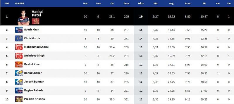 There were no major changes in the Top 10 of the IPL 2021 Purple Cap leaderboard. Harshal Patel, Avesh Khan and Chris Morris continue to be the top three bowlers.