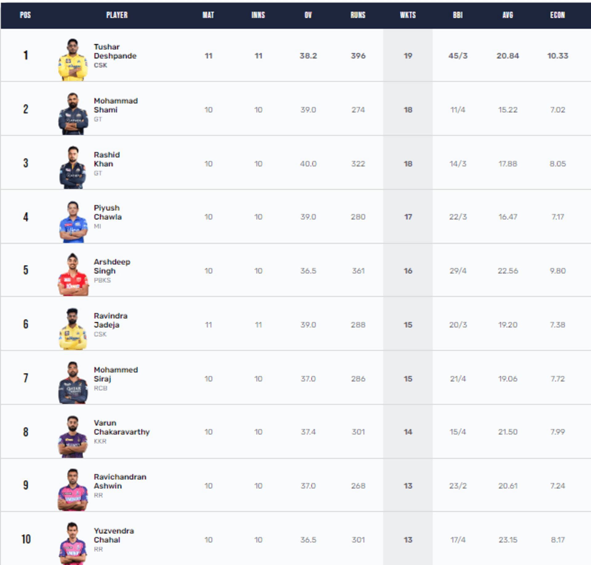 Tushar Deshpande has a one-wicket lead at the top of the wickets chart. The right-arm pacer has 19 wickets in 11 matches at an economy of 10.33.