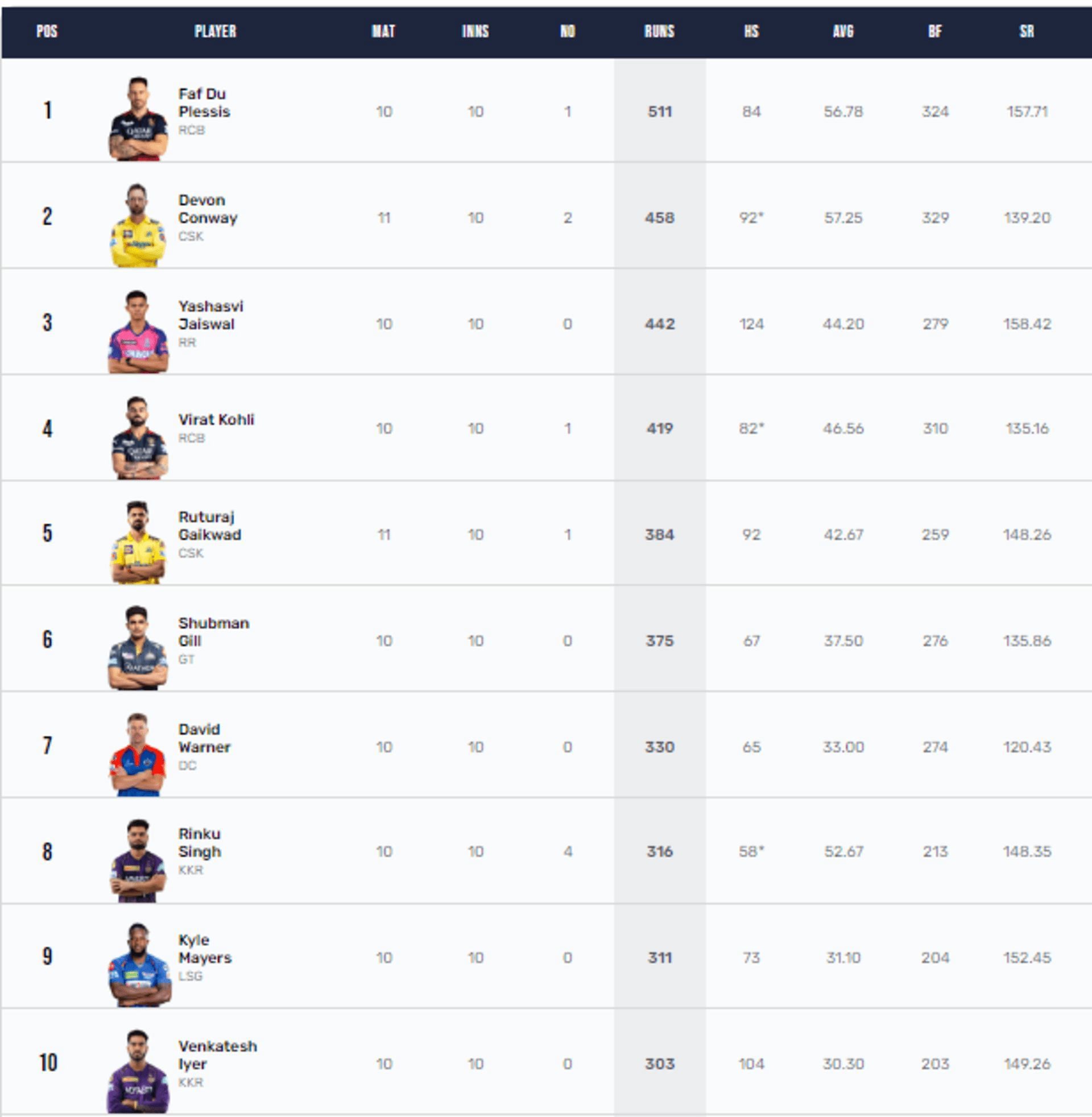 Faf du Plessis crossed the 500-run mark for the season after scoring 45 runs off 32 deliveries before being dismissed by Mitchell Marsh. The RCB skipper has 511 runs in 10 innings at a strike rate of 157. He gained a sizeable lead at the top of the run charts over Devon Conway.