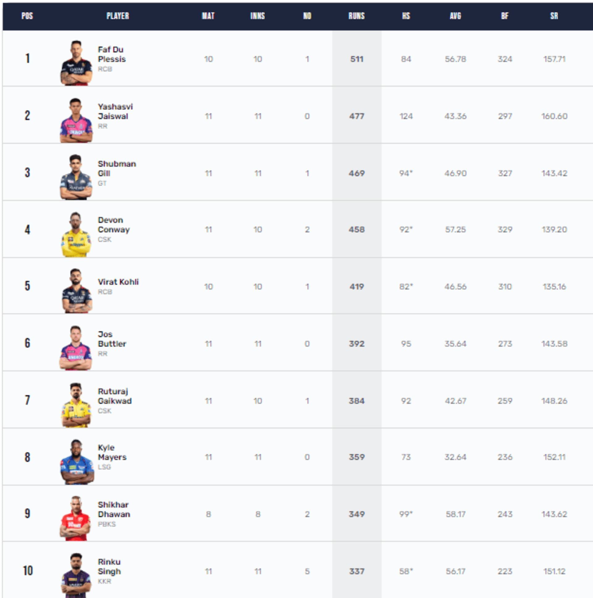 Faf du Plessis is the leading run-scorer of IPL 2023 with 511 runs in 10 matches at a strike rate of 157. He holds the Orange Cap with a 34-run lead over the second-placed Yashasvi Jaiswal.