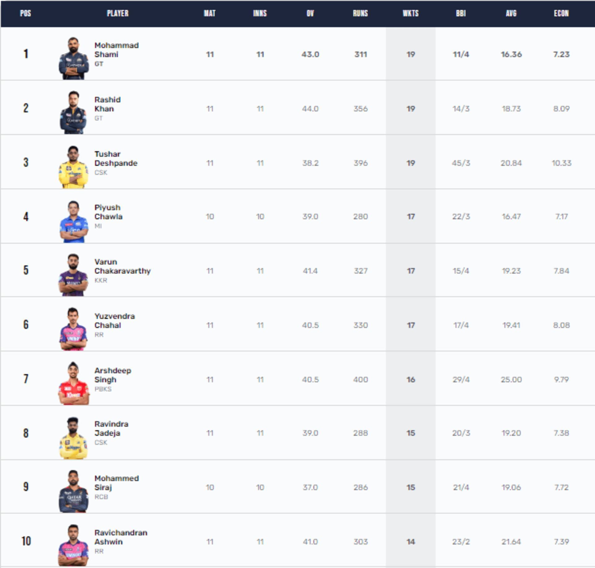 Mohammed Shami and Rashid Khan occupy the top two spots on the list with 19 wickets each, with the former holding the Purple Cap due to a superior economy rate.