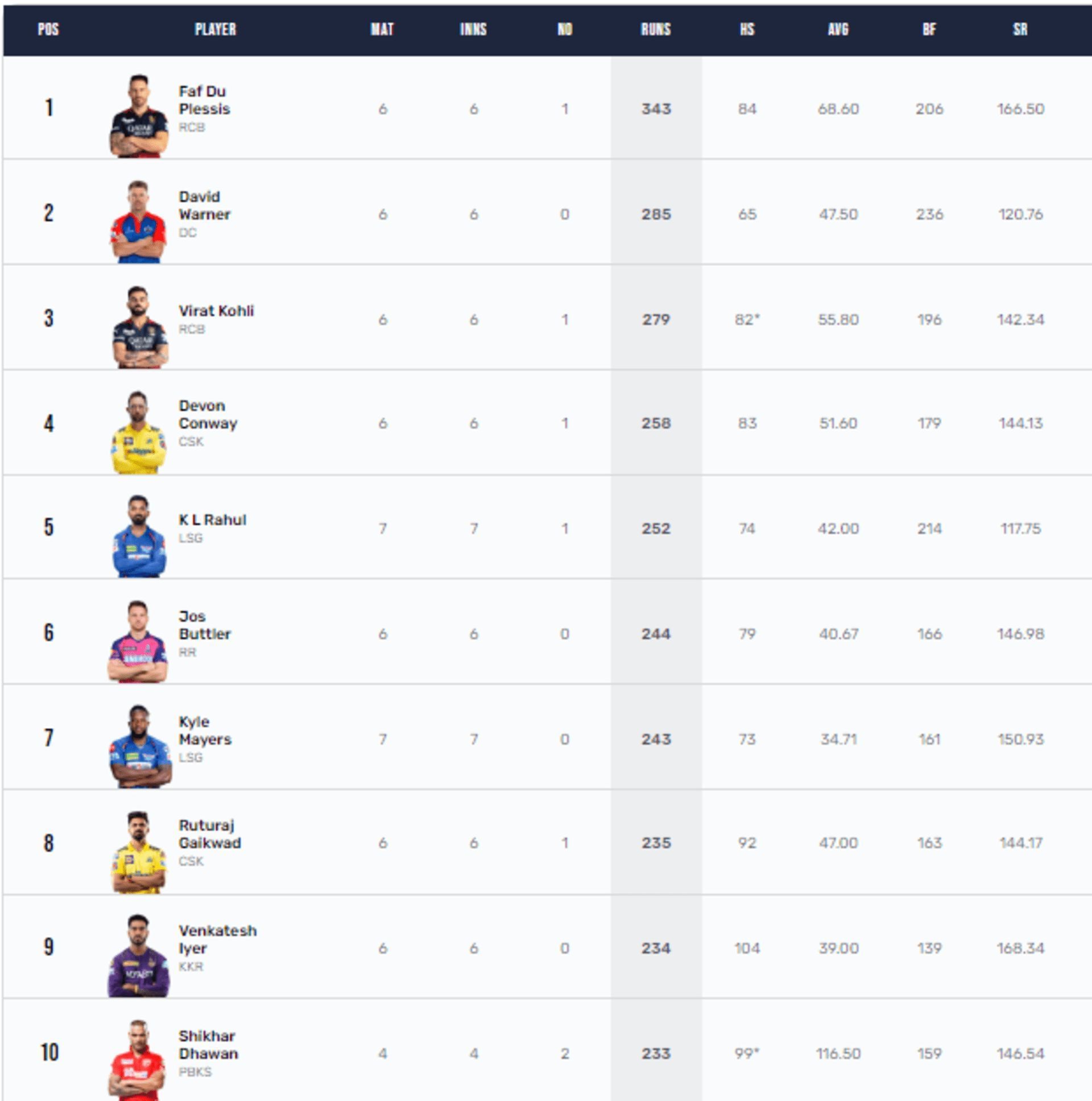 KL Rahul entered the Orange Cap conversation following his second fifty of the campaign. His 68 runs off 61 deliveries, extends his run tally to 252 runs from seven matches at a strike rate of 117.75. He now holds the fifth spot in the run-scoring charts.