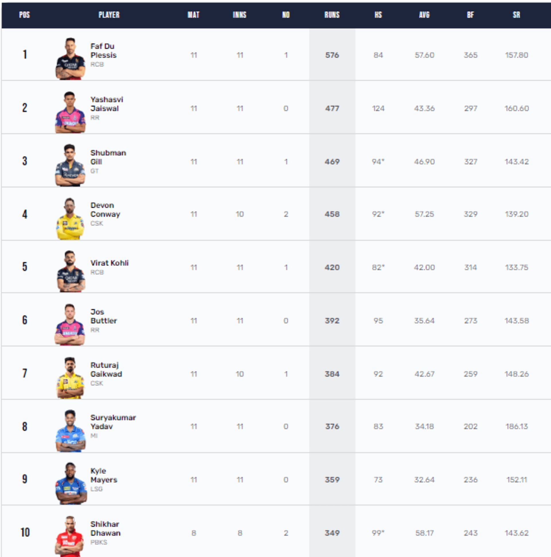 Suryakumar has hit red-hot form at the right time for MI after a sluggish start to the season. With the highest score of his IPL career so far, the right-handed batter climbed to the eighth spot with 376 runs in 11 innings.