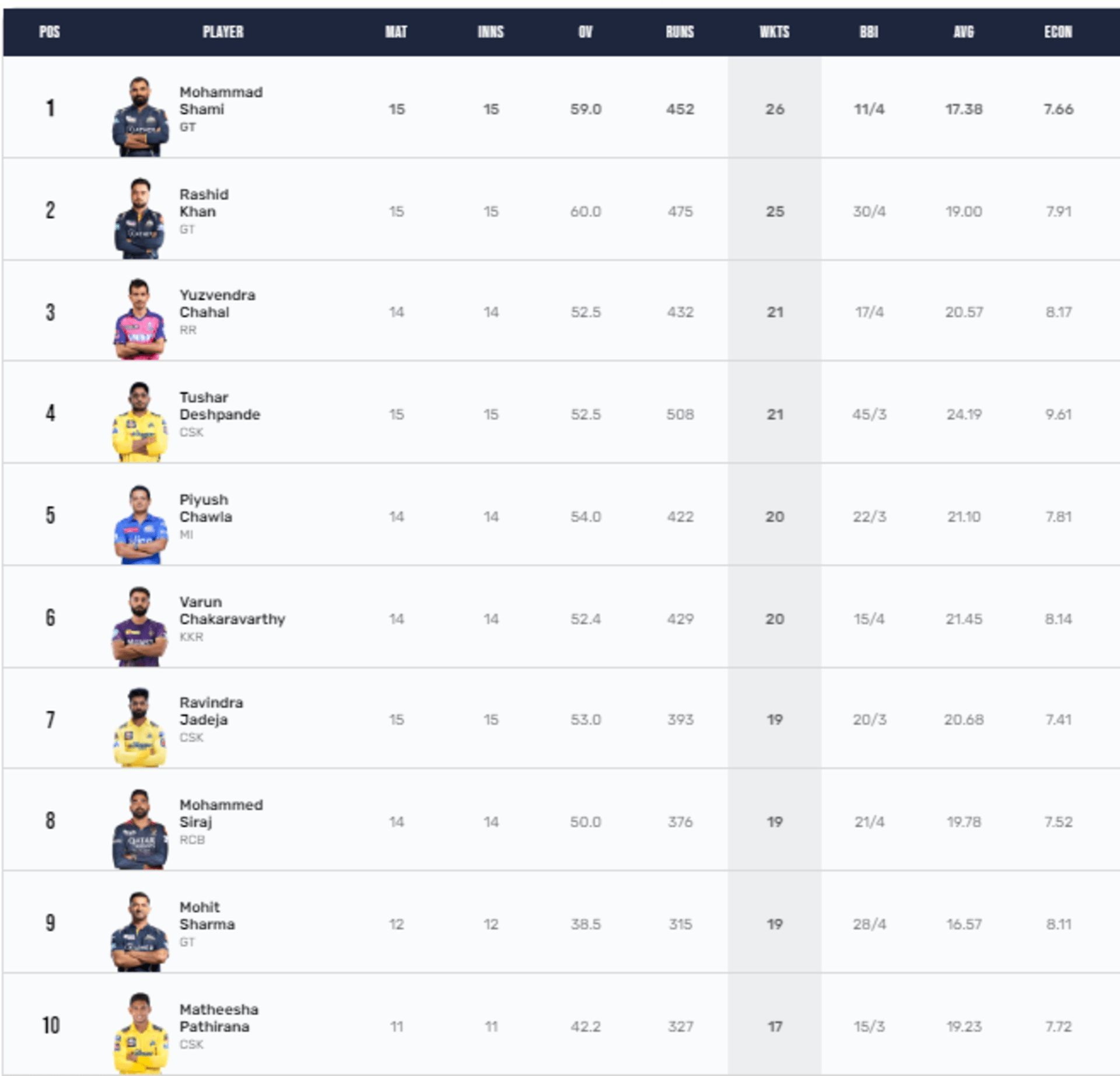 Mohammed Shami extended his lead at the top of the wickets chart after finishing with figures of 2/28 off his four overs. The right-arm pacer now has 26 wickets for the season at an economy of 7.66.