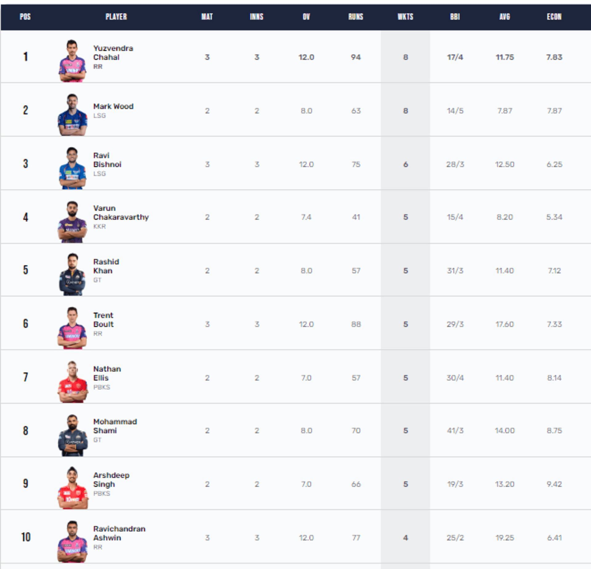 Yuzvendra Chahal took the wickets of Axar Patel, Abhishek Porel, and David Warner to end with figures of 3-27, stretching his wicket tally to eight, which also gives him the Purple Cap from Mark Wood for the time being.