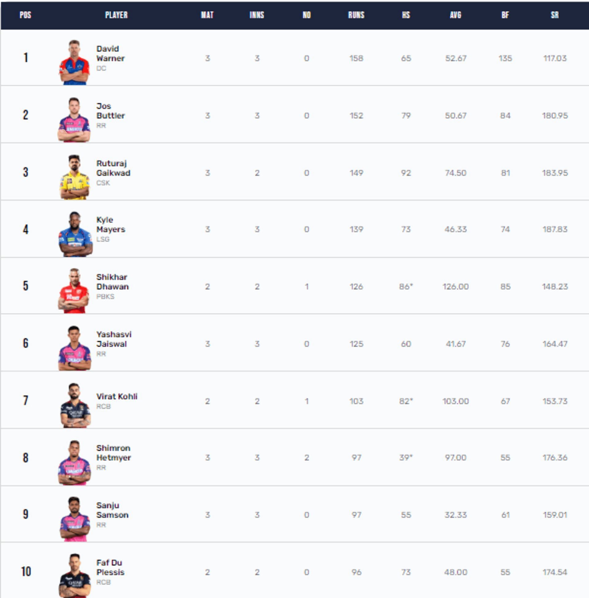 Warner is the new recipient of the IPL 2023 Orange Cap after overtaking Ruturaj Gaikwad and Jos Buttler on the run-scoring charts. The DC skipper registered 65 off 55 deliveries, scoring almost half of the team's total. His 158 run-tally for the season after three matches puts him at the top.