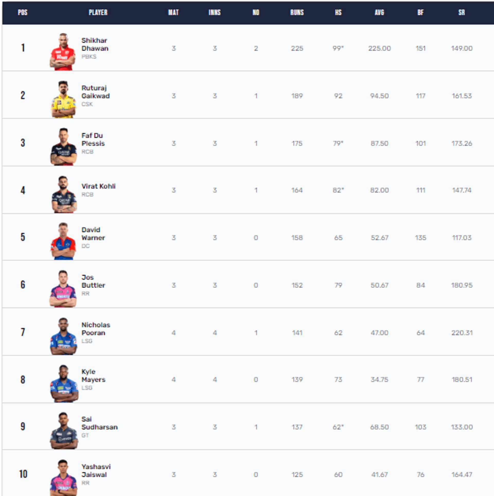 RCB skipper Faf du Plessis also made an impression in the franchise's second home game after becoming the top scorer in the first innings. He scored an unbeaten 79 off 46 deliveries to steer RCB to a mammoth total. The excellent knock takes his run tally to 175 runs for the season and puts him third on the run-getters list for the season,