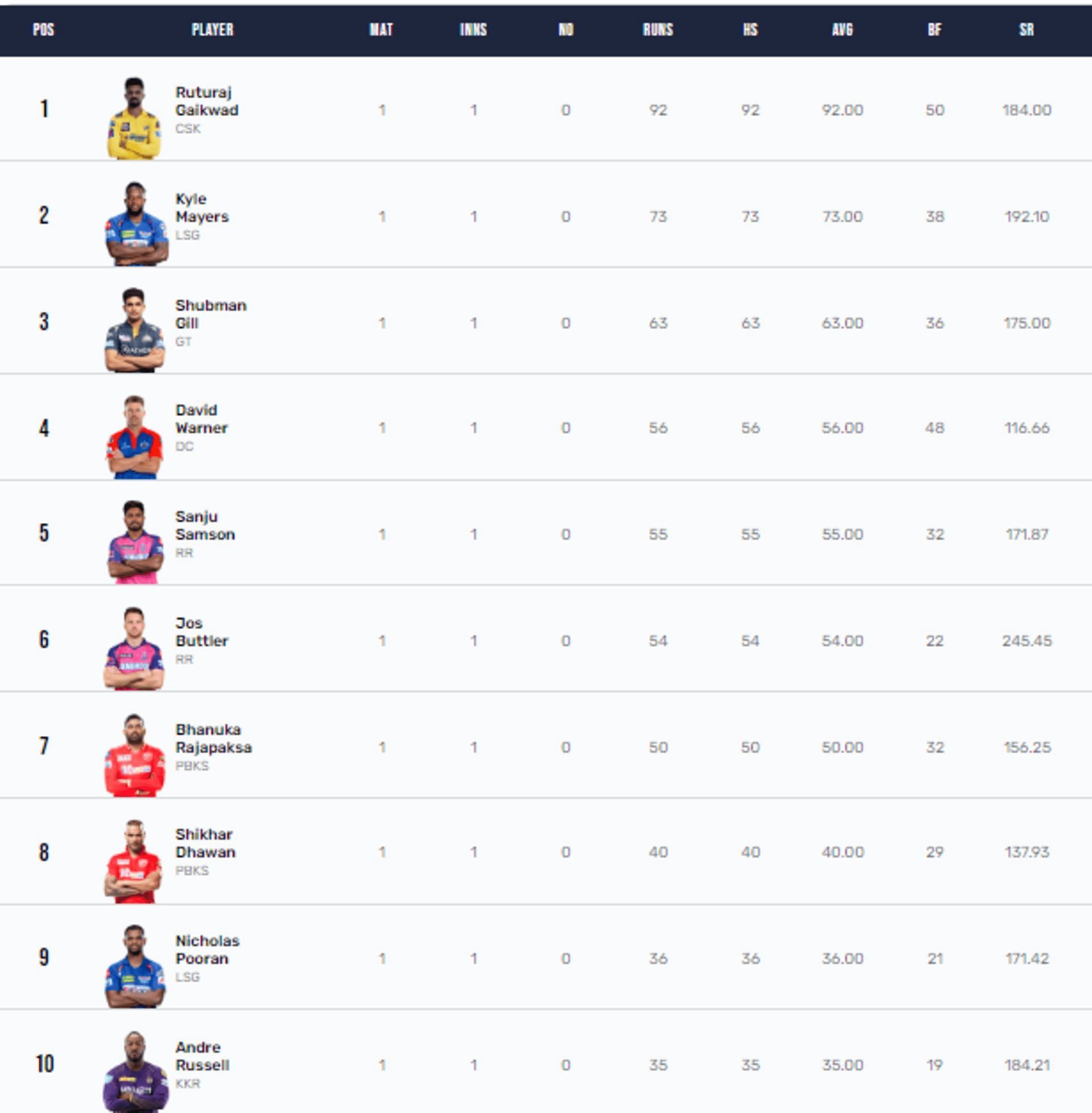 Sanju Samson, the top scorer in the first innings, narrowly pipped his teammates to occupy the fifth spot. The RR skipper scored 55 off 32 deliveries, including three boundaries and four sixes, to continue his trend of beginning the season on a bright note.